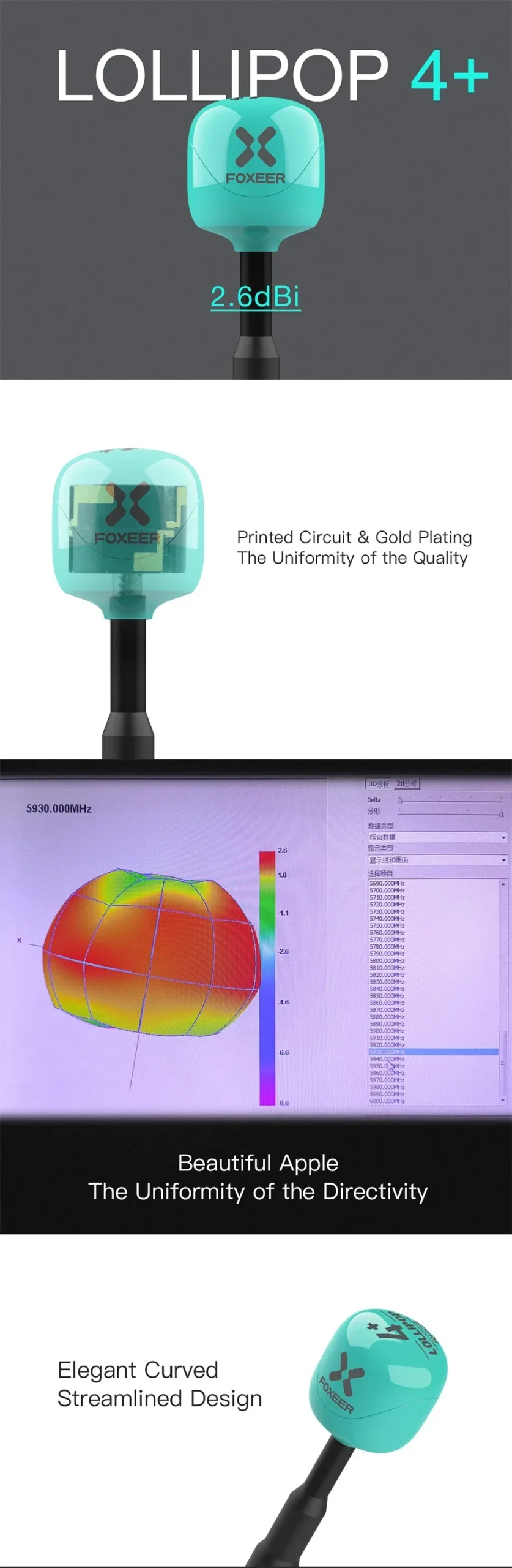The Foxeer Lollipop 4+ 4+ is a high-performance mini antenna designed for FPV racing drones. This antenna features a center frequency of 5.75GHz, a gain of 2.6dBi, and an axial ratio close to 1. It offers excellent radiation efficiency with a value of 98% and has a SWR of 1.07 at the center frequency.