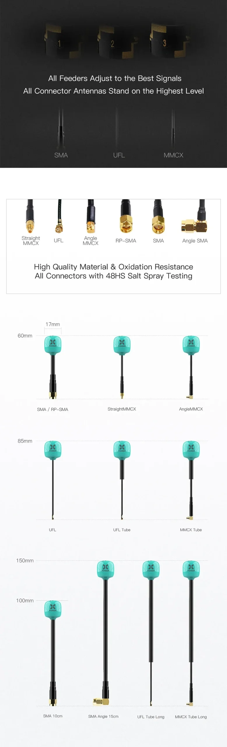 The antenna is available in various configurations, including SMA/RPSMA, Straight MMCX, Angle MMCX, and UFL options, each with different weights depending on the connector and length. The antenna also comes in different case materials, such as PC+ABS.
