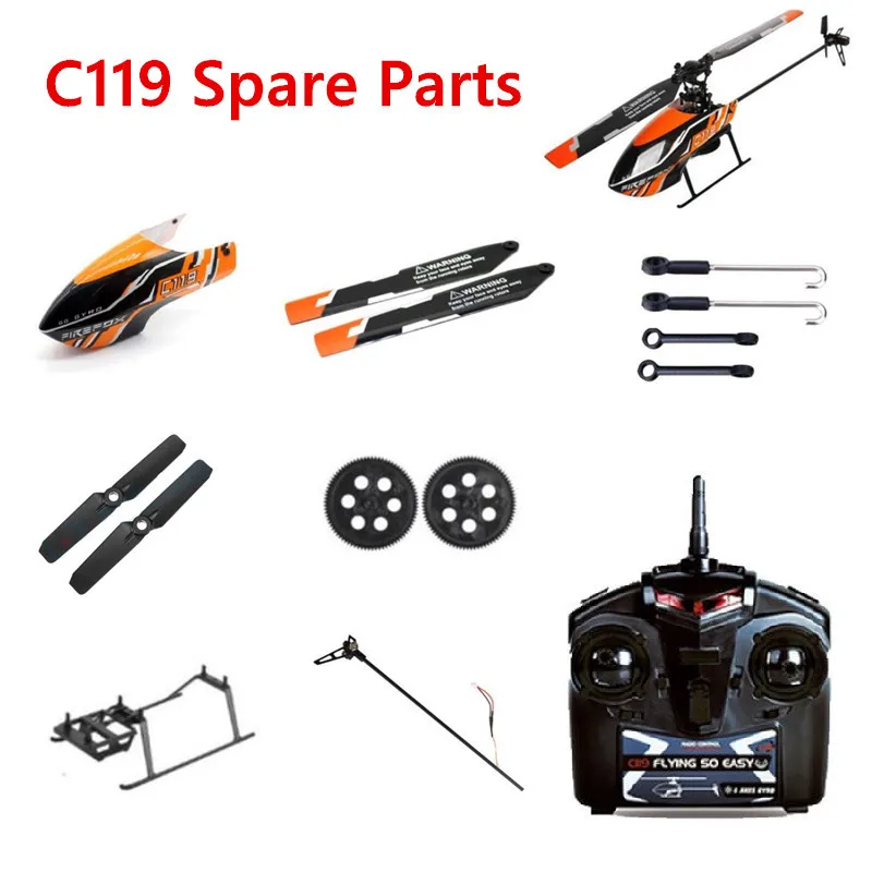C119 4CH RC Helicopter Spare Parts Kit – Upgrade or repair your C119 4CH RC helicopter with this comprehensive spare parts kit, including propeller, canopy, main frame, gear, motor, blade, receiver, and servo.