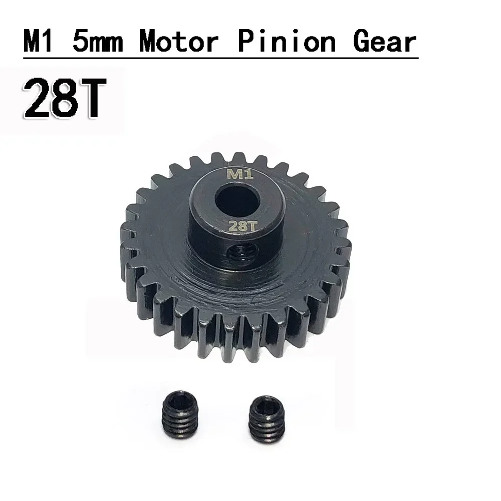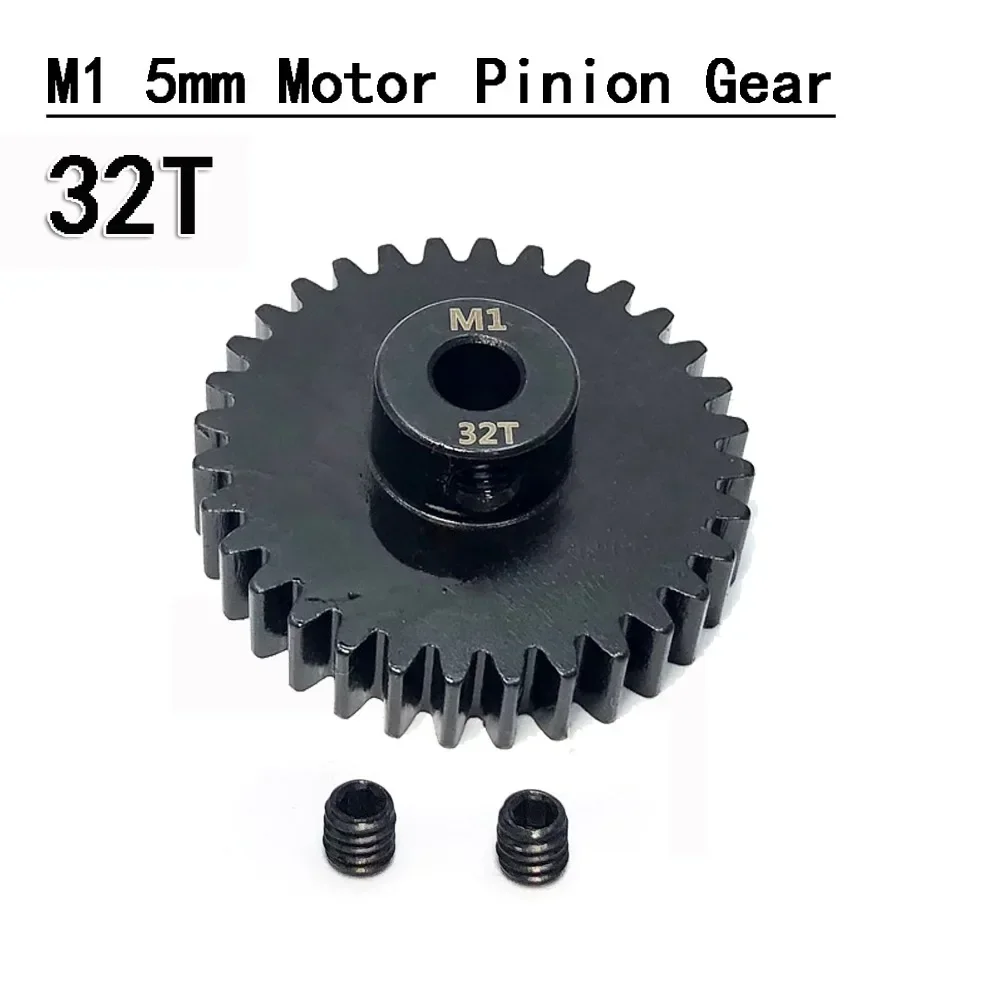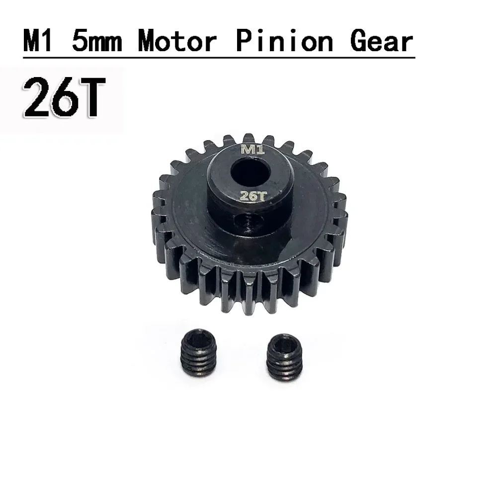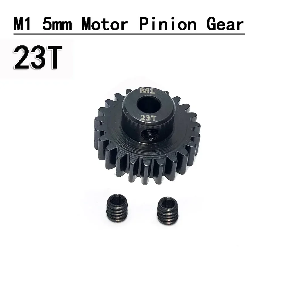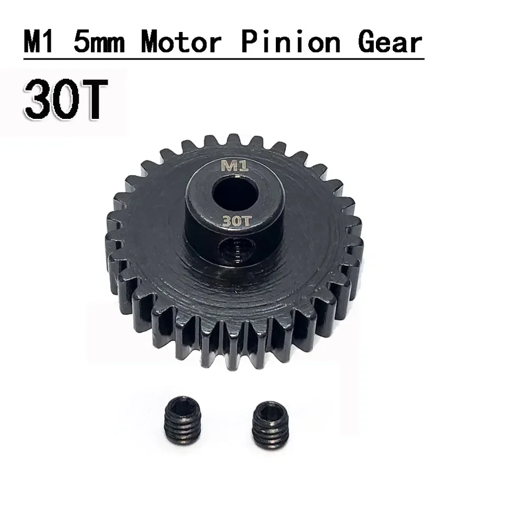 Our pinion motor gear is made of high-quality 45# material, blackened and hardened for durability and precision. It features a M1 modulus and an inner diameter of 5mm with a machine screw. The T number ranges from 11T to 30T, providing a wide range of options for your RC buggy, truggy, or monster truck.