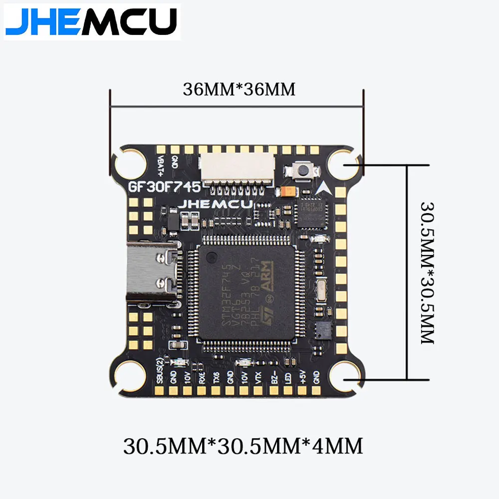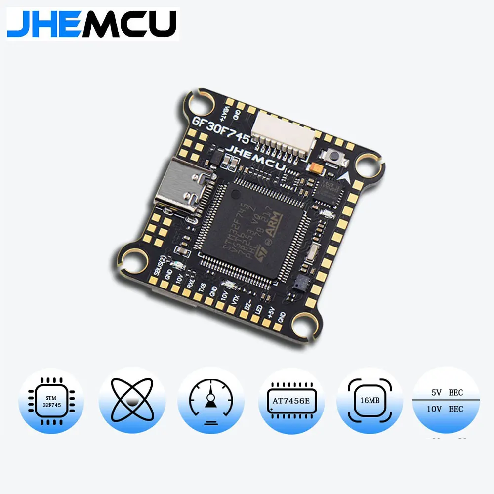 The JHEMCU F745 Flight Controller Stack is a high-performance flight controller designed for RC FPV drones. It features a STM32F745VG microcontroller, ICM-42688-P gyroscope, SPL06 barometer, and AT7456E OSD chip. The flight controller supports various protocols including ELRS, TBS, SBUS, IBS, DSM2, and DSMX.