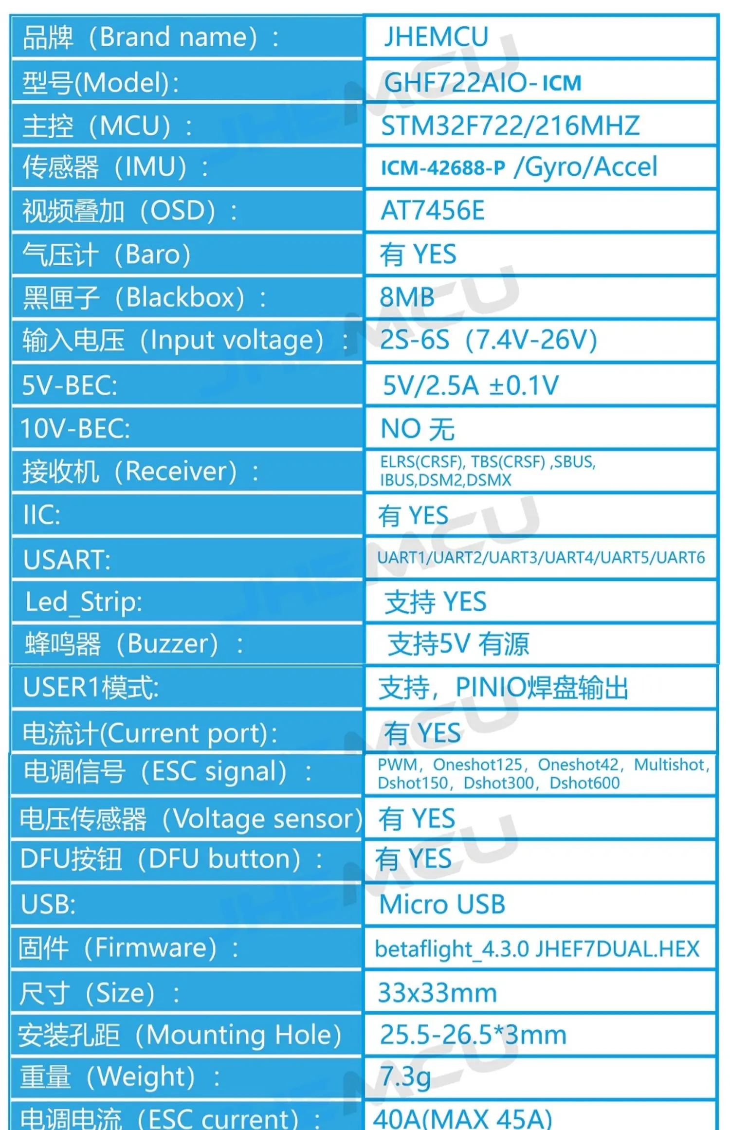 | Firmware | Betaflight -4.3.0 JHEF7DUAL.HEX |