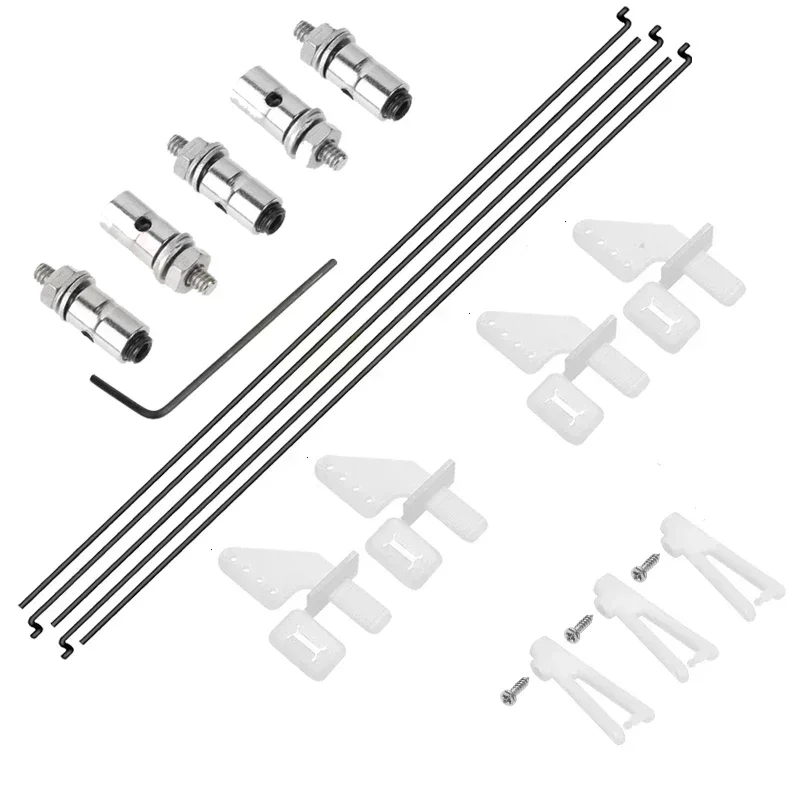Designed for RC airplanes and scale models, this set includes 5x control horns (20x11mm), 5x clevises (1.2x21mm), 5x pushrod connectors (1.3mm), and 5x steel Z-style pushrods (1.2x180mm). The control horns feature 4 holes for easy installation and are compatible with 1.0/1.1/1.2/1.3mm push rods.
