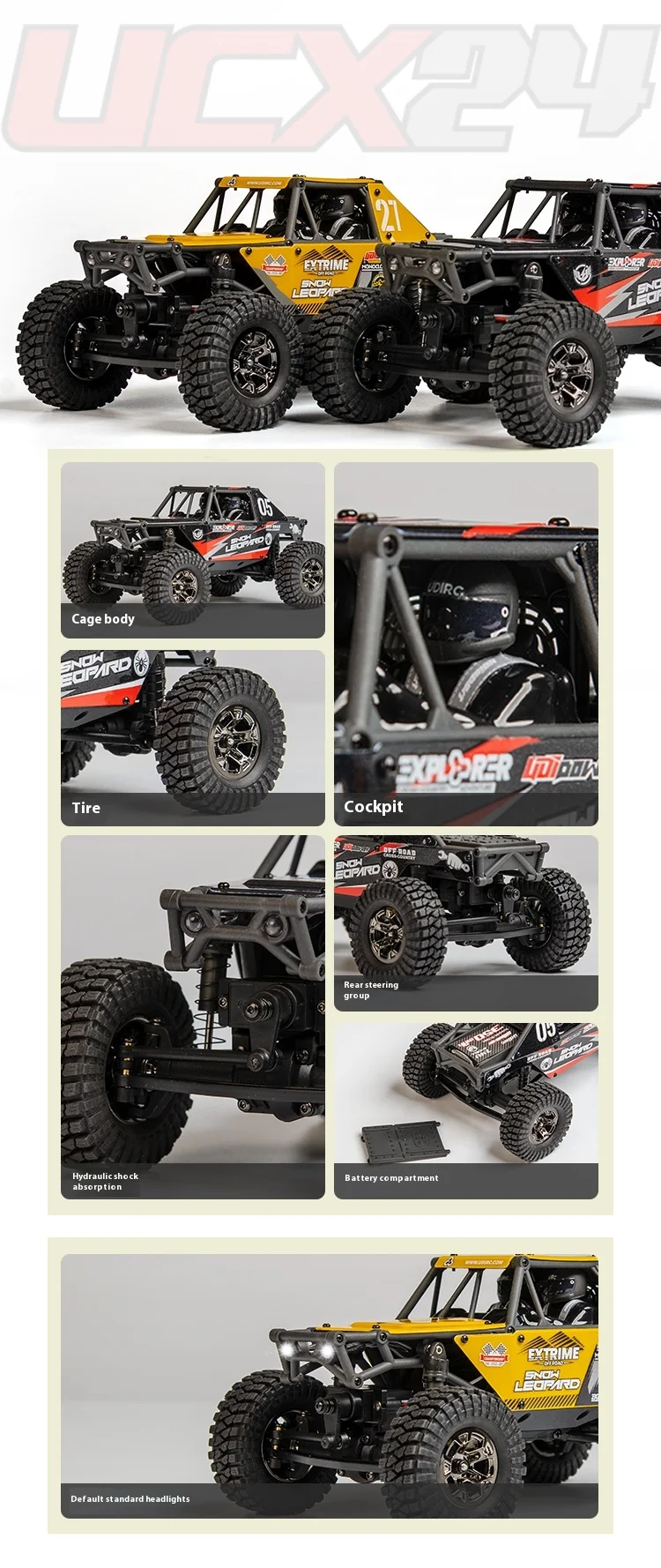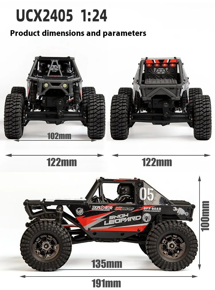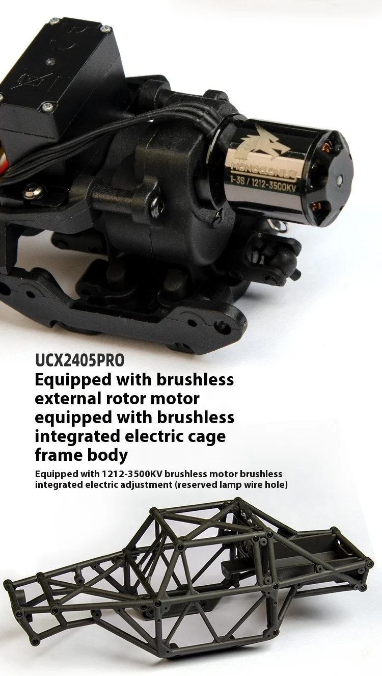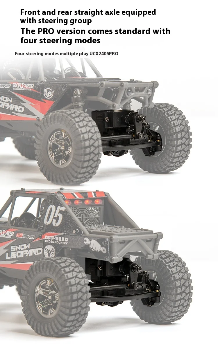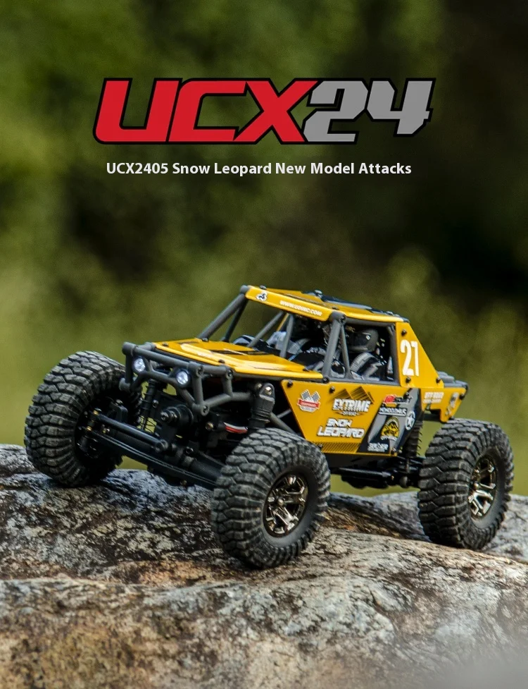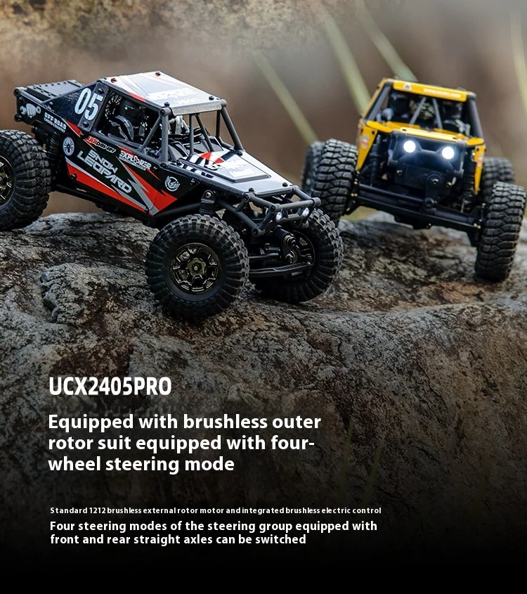 The UCX24 UCX2405 is a 1/24 scale brushless motor powered mini rock crawler with four-wheel steering capabilities. This RTR (Ready-To-Run) RC car features a 3-speed transmission and is designed for outdoor use.