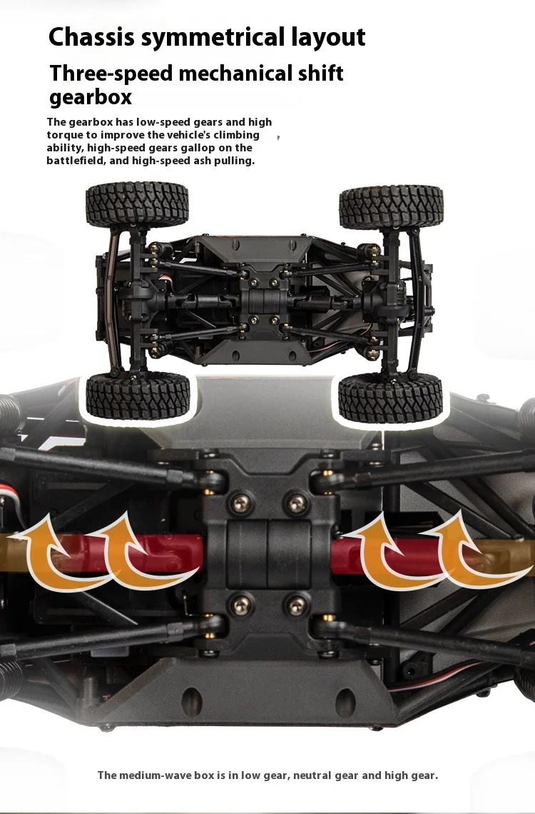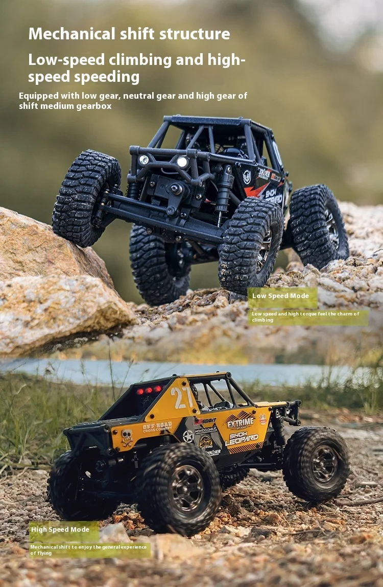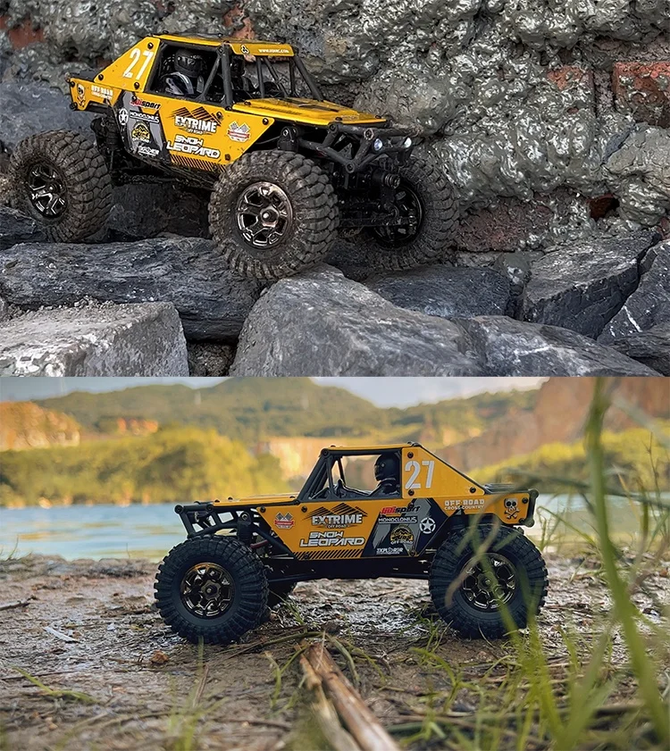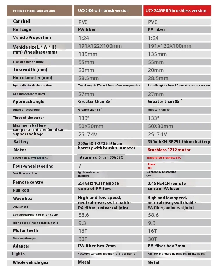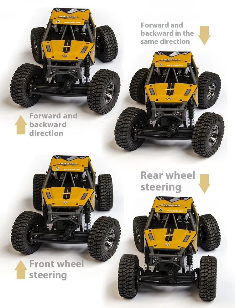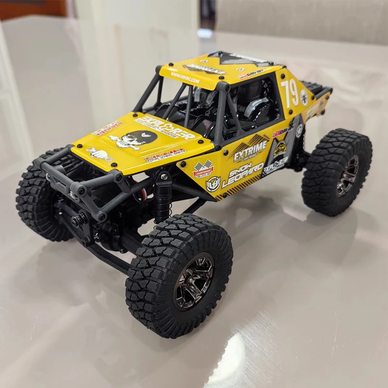 The UCX24 UCX2405 is a 1/24 scale brushless motor powered mini rock crawler with four-wheel steering capabilities. This RTR (Ready-To-Run) RC car features a 3-speed transmission and is designed for outdoor use.